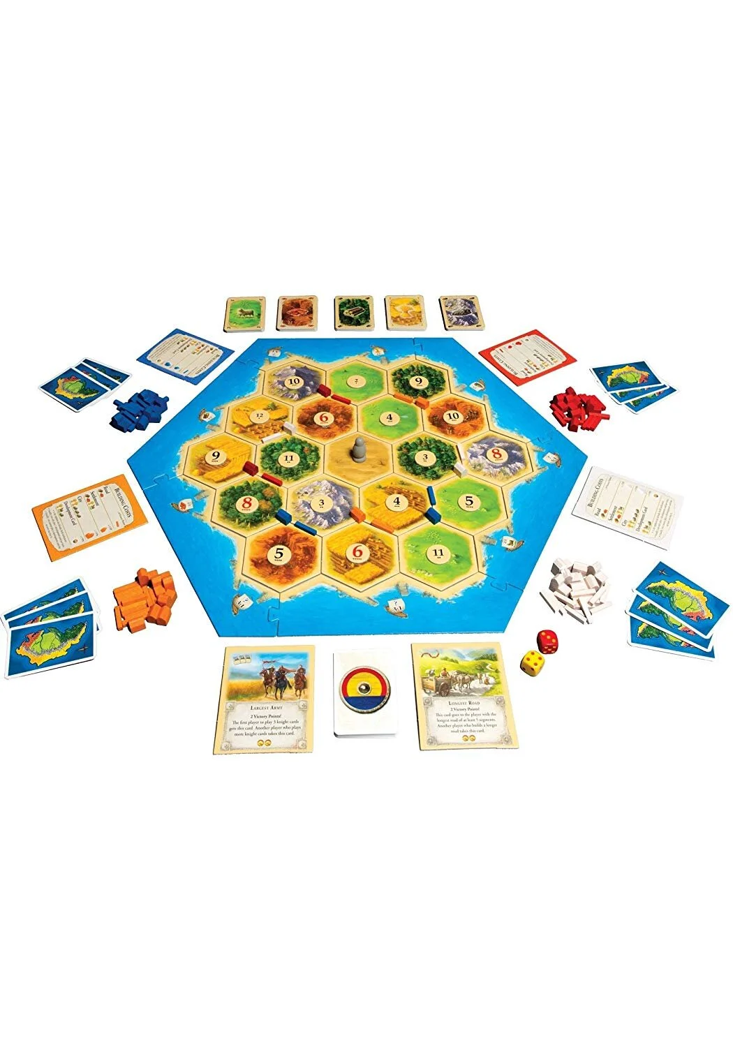 In Catan (formerly The Settlers of Catan), players try to be the dominant force on the island of Catan by building settlements, cities, and roads. On each turn dice are rolled to determine what resources the island produces. Players collect these resources (cards)—wood, grain, brick, sheep, or stone—to build up their civilizations to get to 10 victory points and win the game.